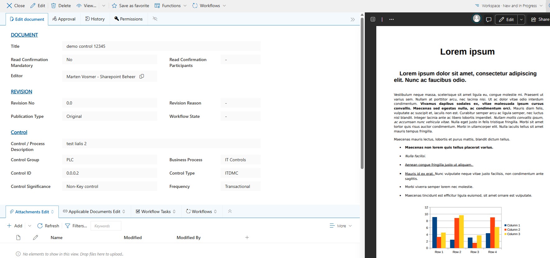 Na afronding van de wijzigingen wordt opnieuw de goedkeuringsworkflow gestart. Pas na succesvolle review en approval wordt de nieuwe versie (bijvoorbeeld versie 2) gepubliceerd in Valid Documents en vervangt deze de vorige geldige versie.