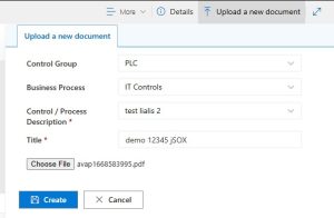 Bij het uploaden van een nieuw document selecteert de gebruiker een control via een beperkt aantal verplichte single-value velden (Control Group, Business Process, Control / Process Description). Gebruikers zien alleen de controls waarvoor zij als Preparer zijn toegewezen, wat focus en juistheid garandeert.
