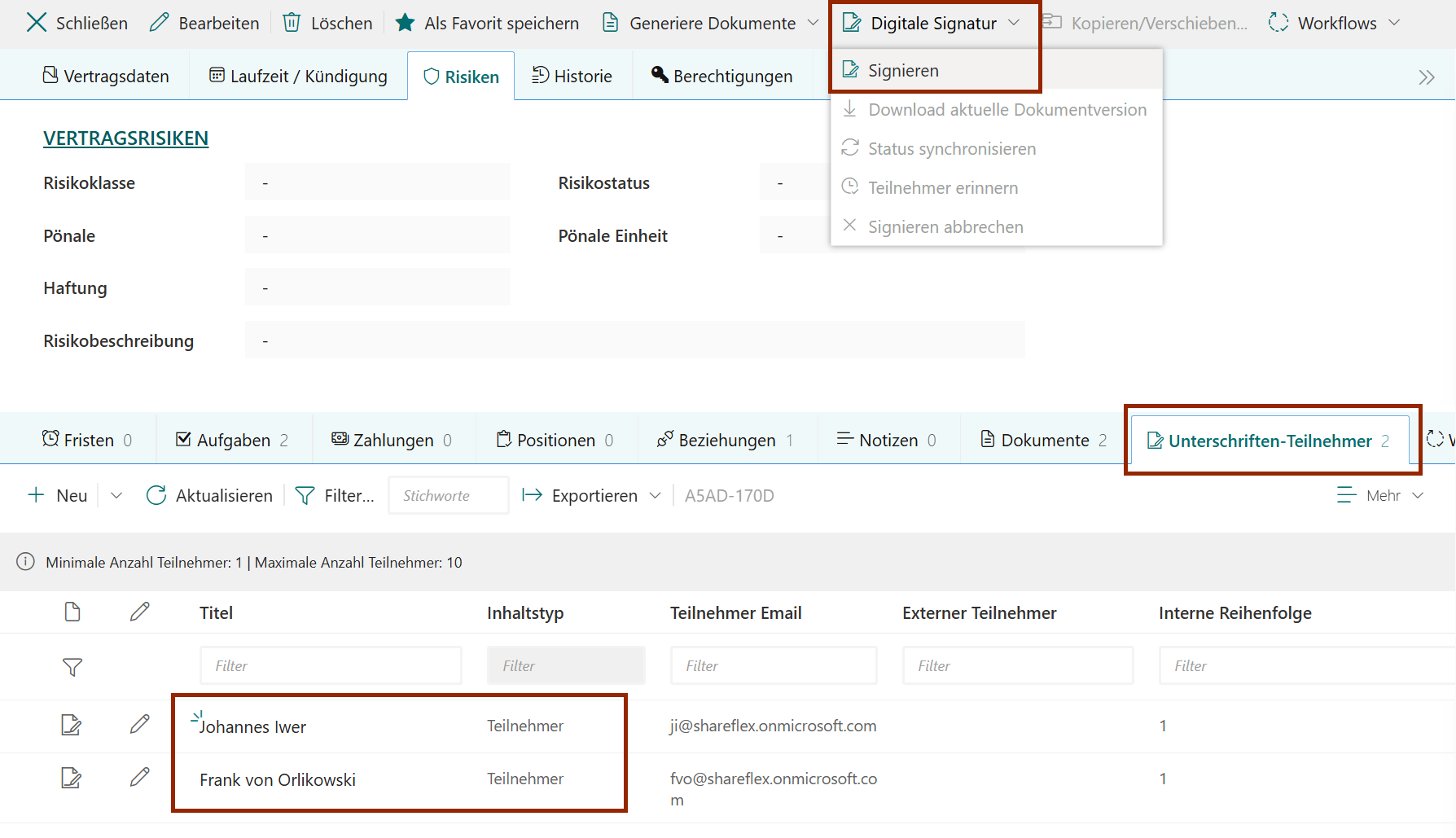 Met de Shareflex DigitalSign-module kunnen gebruikers ondertekenaars direct beheren in de Shareflex-webinterface. De secundaire lijst in het contract-/documentdossier geeft een duidelijk overzicht van alle deelnemers en hun status.