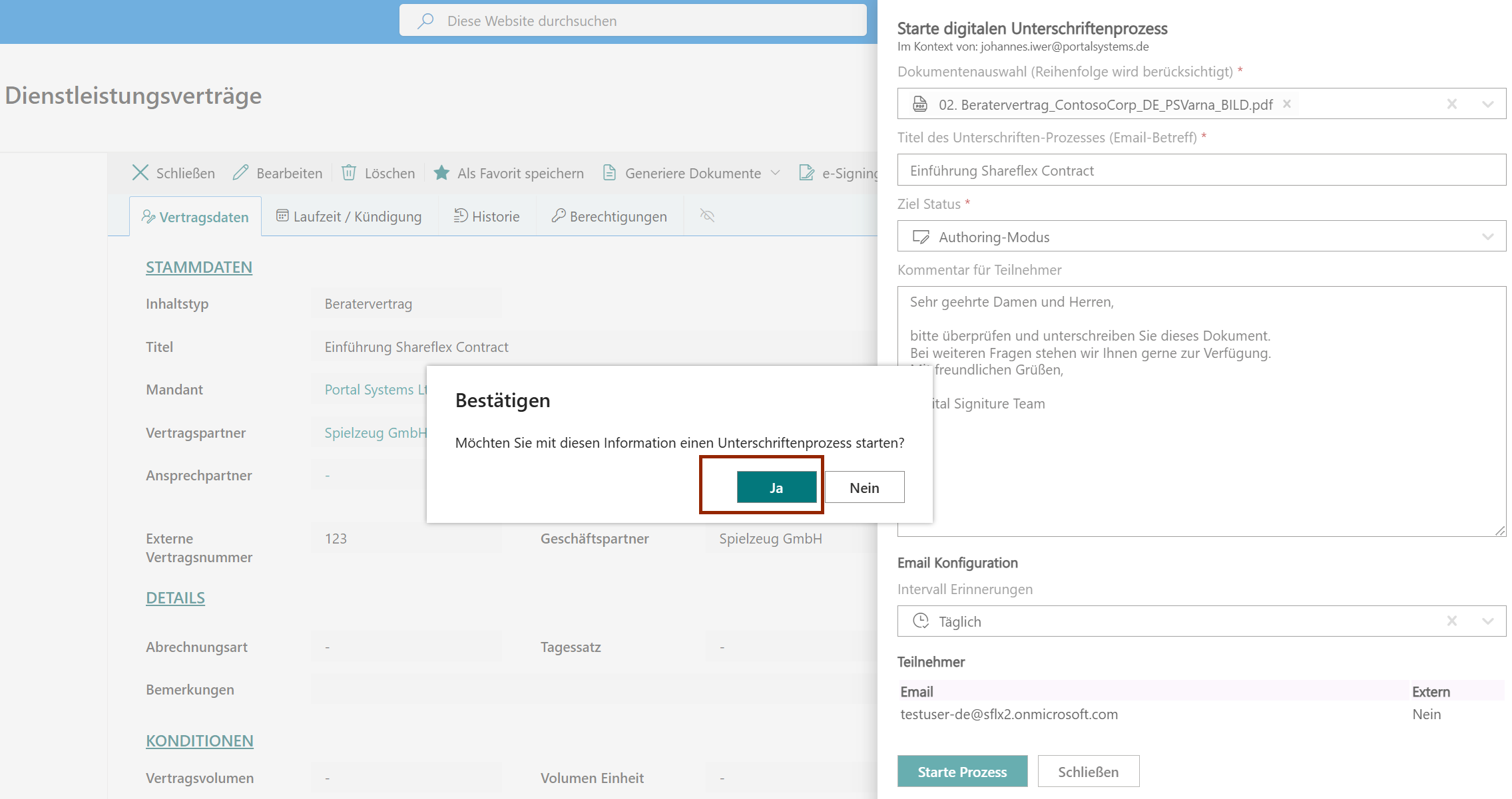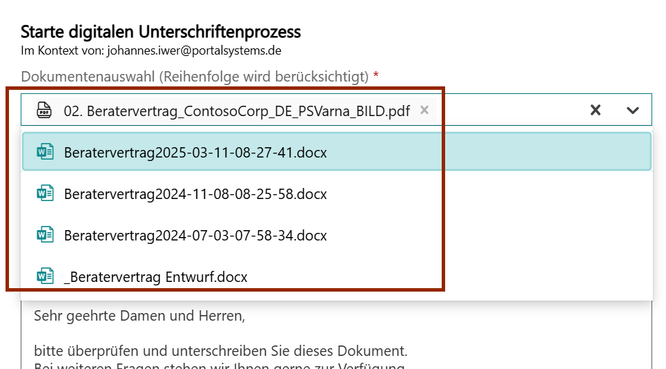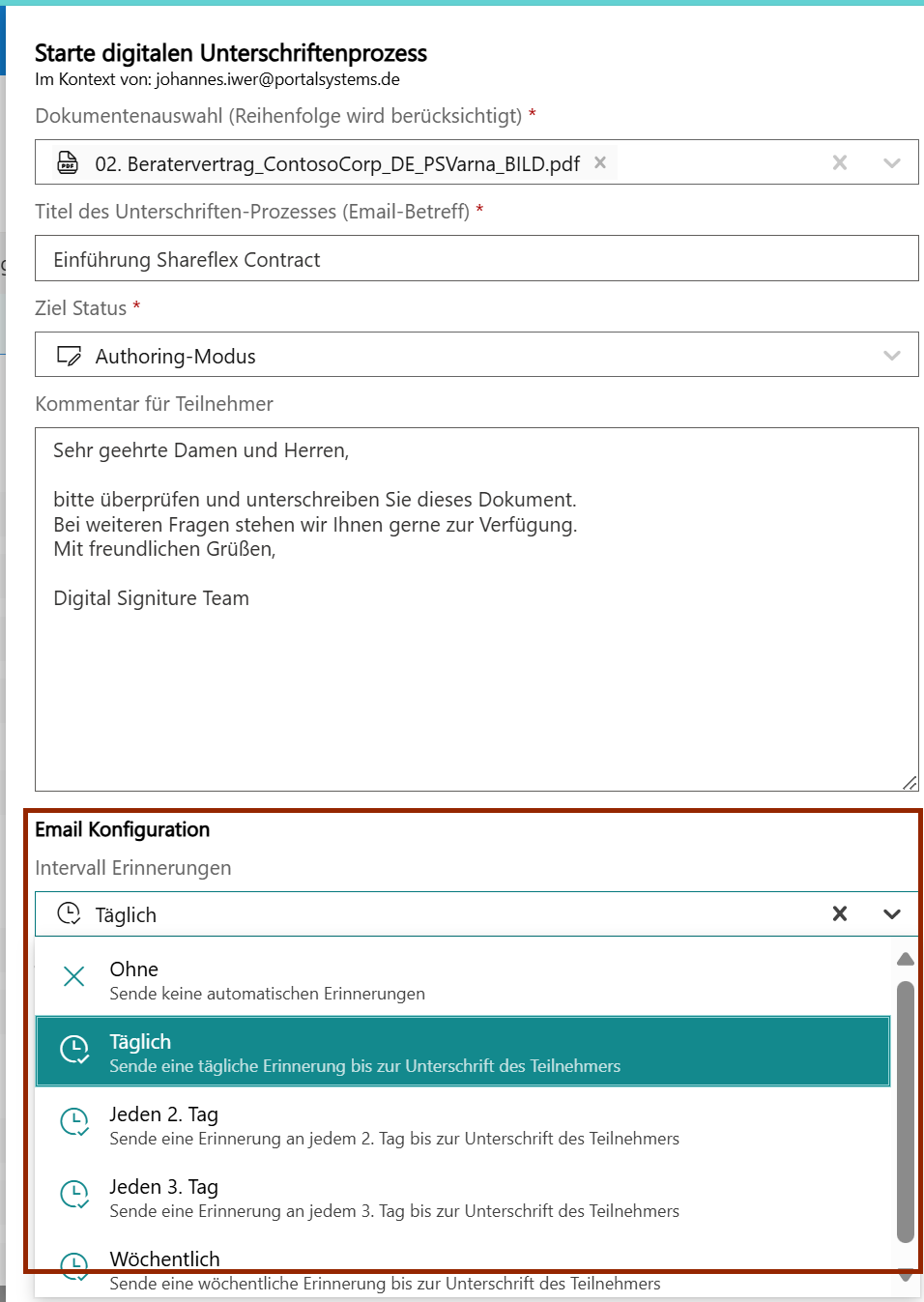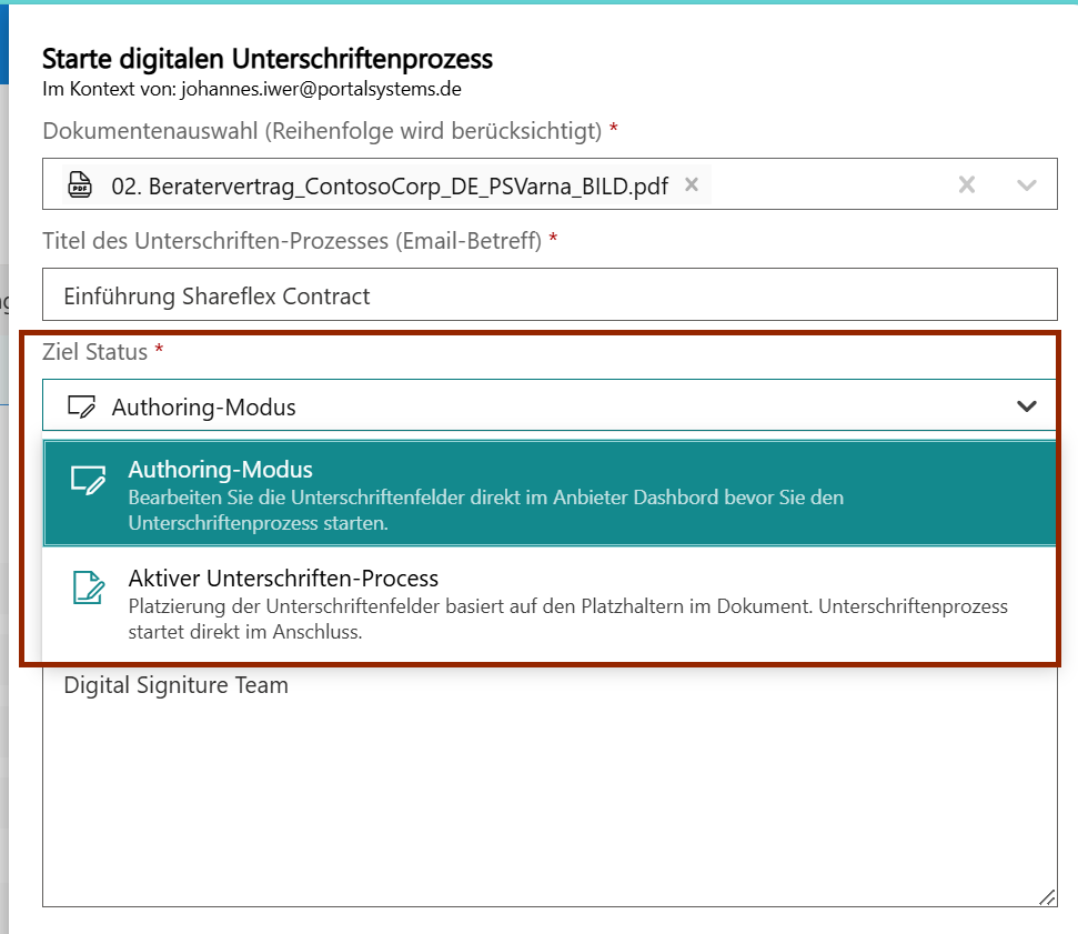 - Ondertekening starten: selecteer documenten, configureer e-mails/herinneringen en activeer eventueel authoring-modus.