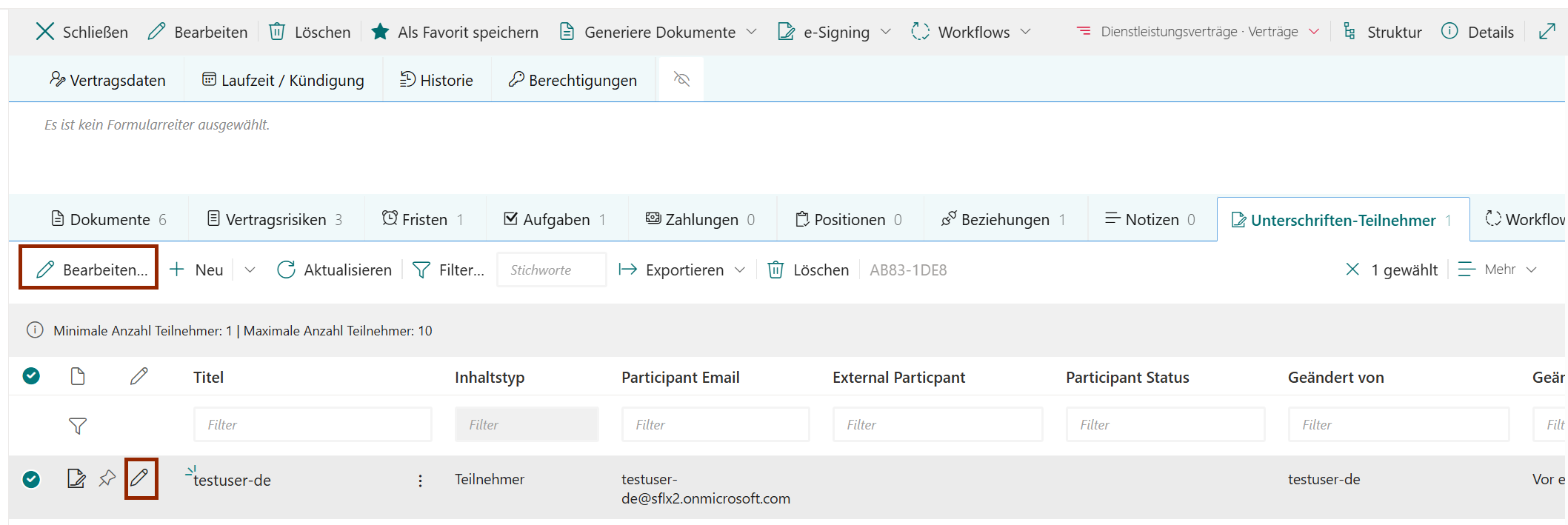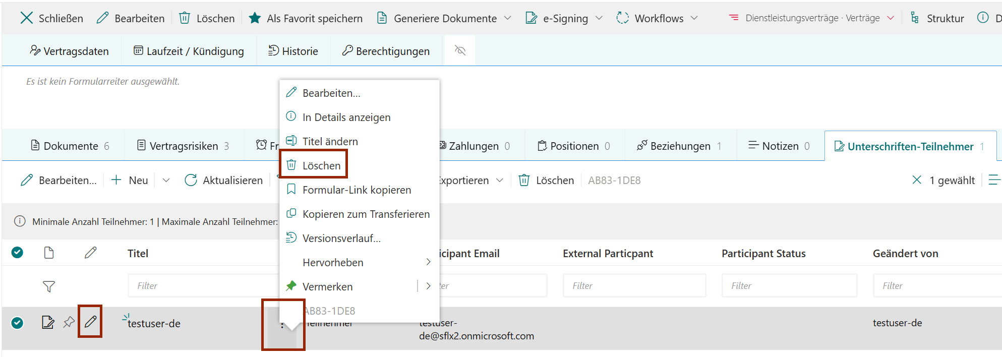 Deelnemers kunnen alleen worden bewerkt vóór het starten van het ondertekenproces. Selecteer de regel en klik op Edit (of gebruik het